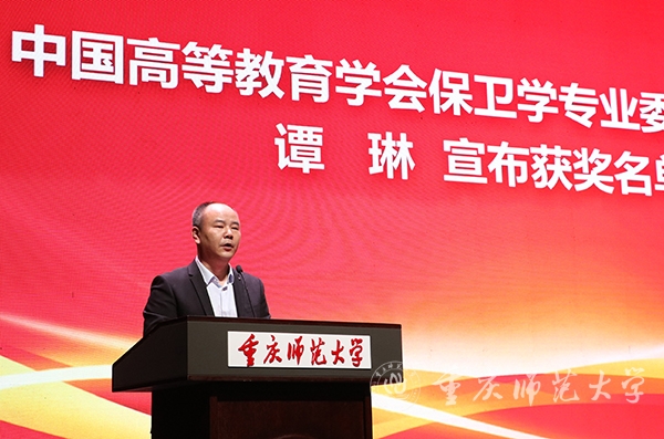 中国高等教育学会保卫学专业委员会秘书长谭琳宣布2023年高校国家安全教育教学风采展示获奖名单。