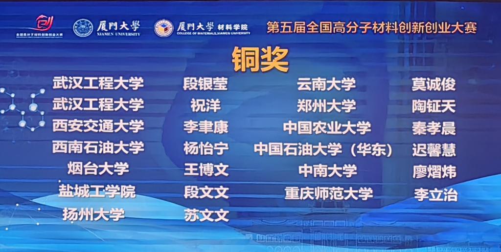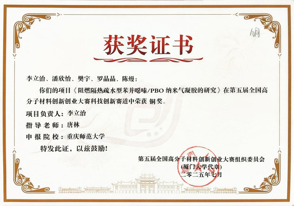 7月11-12日,由教育部高等学校材料类专业教学指导委员会、国家级实验教学示范中心联席会材料/纺织服装学科组指导,全国高分子材料创新创业大赛组织委员会主办,厦门大学承办的“第五届全国高分子材料创新创业大赛”决赛于厦门大学思明校区成功举行。bw必威化学学院李立治、潘欣怡、樊宇、罗晶晶、陈熳等同学在指导老师唐林的帮助下完成的参赛作品《阻燃隔热疏水型苯并噁嗪/PBO纳米气凝胶》获得科技创新赛道全国铜奖,进一步展示了bw必威学子在创新创业方面的风采。