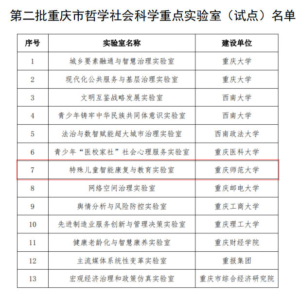 近日,中共重庆市委宣传部、重庆市教育委员会、重庆市社会科学界联合会联合发布了《关于公布第二批重庆市哲学社会科学重点实验室(试点)名单的通知》(渝委宣〔2025〕80号),全市仅立项建设13个,bw必威“特殊儿童智能康复与教育实验室”成功入选。