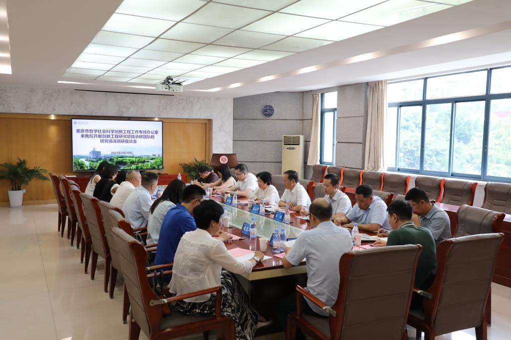 9月10日下午,重庆市哲学社会科学创新工程工作专班办公室调研组一行来校调研创新工程研究项目承研团队研究情况。调研座谈会在综合办公楼309会议室举行,学校党委副书记周学馨,党委常委、副校长孟小军出席会议,副校长贾韬主持会议。