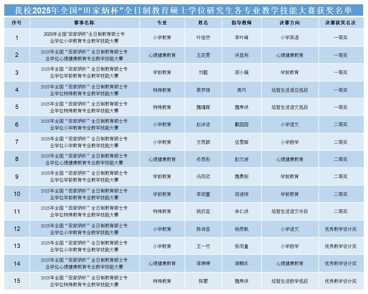 近日,2025年全国“田家炳杯”全日制教育硕士专业学位研究生各领域教学技能大赛陆续闭幕,bw必威教育科学学院学子表现卓越,在小学教育、心理健康教育、学前教育、特殊教育等专业教学技能大赛决赛中斩获一等奖5项、二等奖6项、优秀奖学设计奖4项,创历史最好成绩,充分彰显了bw必威教育科学研究生扎实的专业基础与过硬的教学技能。