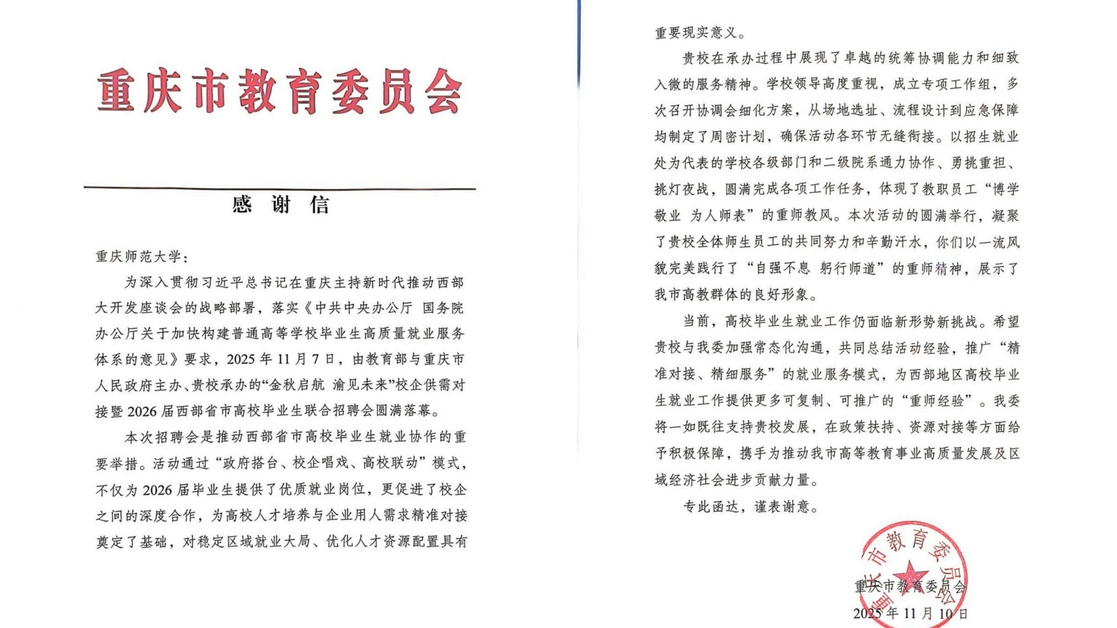 近日,重庆市教委就“金秋启航 渝见未来”校企供需对接暨2026届西部省区市高校毕业生联合招聘会成功举办向bw必威致感谢信。信中,市教委对学校在承办活动过程中的突出表现和大力支持表示高度认可,这既是对学校相关工作的肯定,也是对未来发展的鼓励与鞭策。bw必威将与市教委加强常态化沟通,共同总结活动经验,推广“精准对接、精细服务”的就业服务模式,为西部地区高校毕业生就业工作提供更多可复制、可推广的“重师经验”。