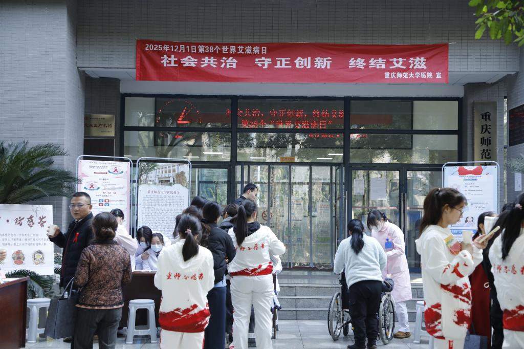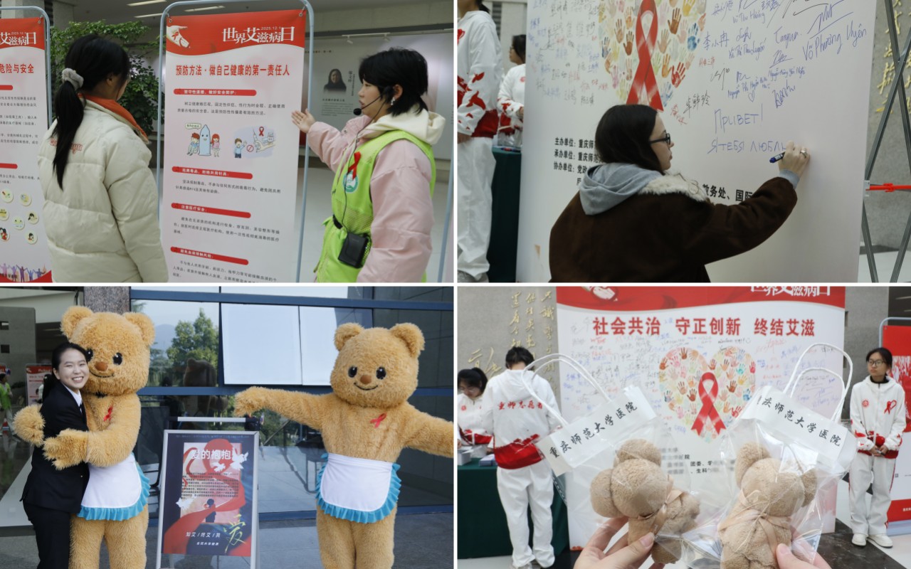 抗艾防艾健康教育大讲座在校友会堂开讲,重庆市疾控中心防艾专家欧阳琳为师生授课。场外活动区,“防艾心声”匿名墙前,师生们用红丝带便利贴写下“科学防艾,拒绝歧视”等留言,汇成爱心海洋;“爱的抱抱”互动区里,卡通志愿者与师生拥抱合影,传递“无歧视”理念;展板长廊前,志愿者结合图文讲解防艾知识,纠正认知误区;资料发放台有序发放宣传手册、防护用品,让实用知识触手可及,现场互动氛围热烈。