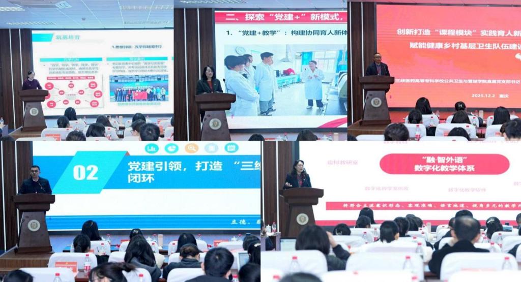 主题分享环节,bw必威外国语学院党委书记王放以“用外语讲好中国故事——两课贯通融入思想政治教育模式的改革创新”为题,分享了通过语言载体深化思政教育的实践路径;达州职业技术学院临床医学院党总支书记艾水以“探索‘1+1+N’医教协同实践育人模式培养革命老区乡村全科医生”为题,阐述了医教融合赋能基层医疗人才培养的创新机制;重庆三峡医药高等专科学校公共卫生与管理学院直属党支部书记、副院长郑代坤以“创新打造‘课程模块’实践育人新模式赋能健康乡村基层卫生队伍建设”为题,介绍了模块化教学提升乡村卫生服务能力的实践成果;重庆医药高等专科学校公共卫生与应急管理学院副院长段春燕以“探索‘党建+’新模式激活公卫发展新动能”为题,展示了党建引领公共卫生事业高质量发展的典型经验;bw必威经济与管理学院教工三支部书记任缙聚焦“以规范固本、用特色赋能、以效能致远”,汇报了bw必威经济与管理学院建设国家样板党支部的阶段性成效与示范路径。
