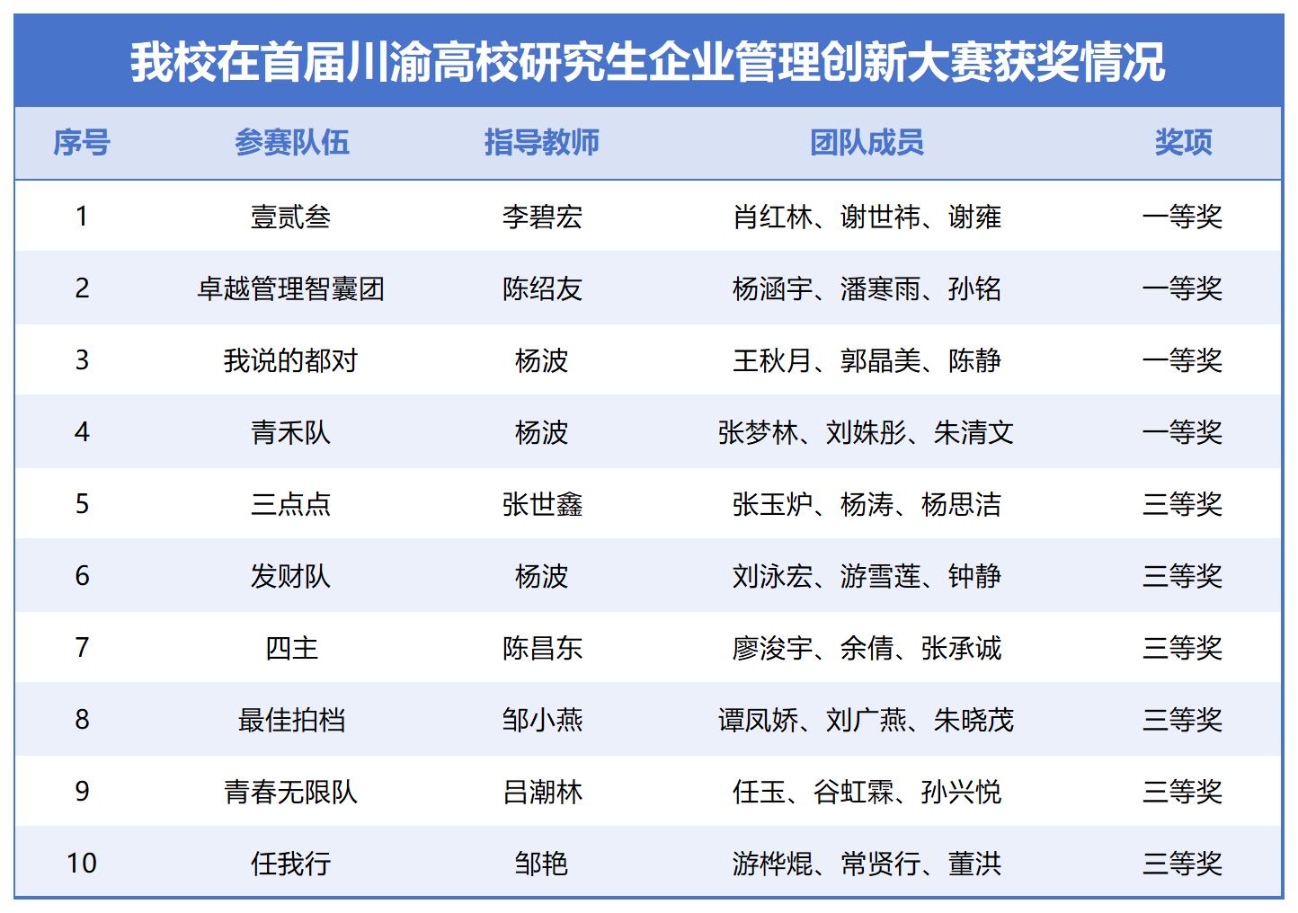 近日,第一届川渝研究生企业管理创新大赛决赛在西南政法大学渝北校区举行。在川渝20所高校140支晋级队伍中,bw必威经济与管理学院学子获得一等奖4项、三等奖6项,bw必威荣获“优秀组织奖”。