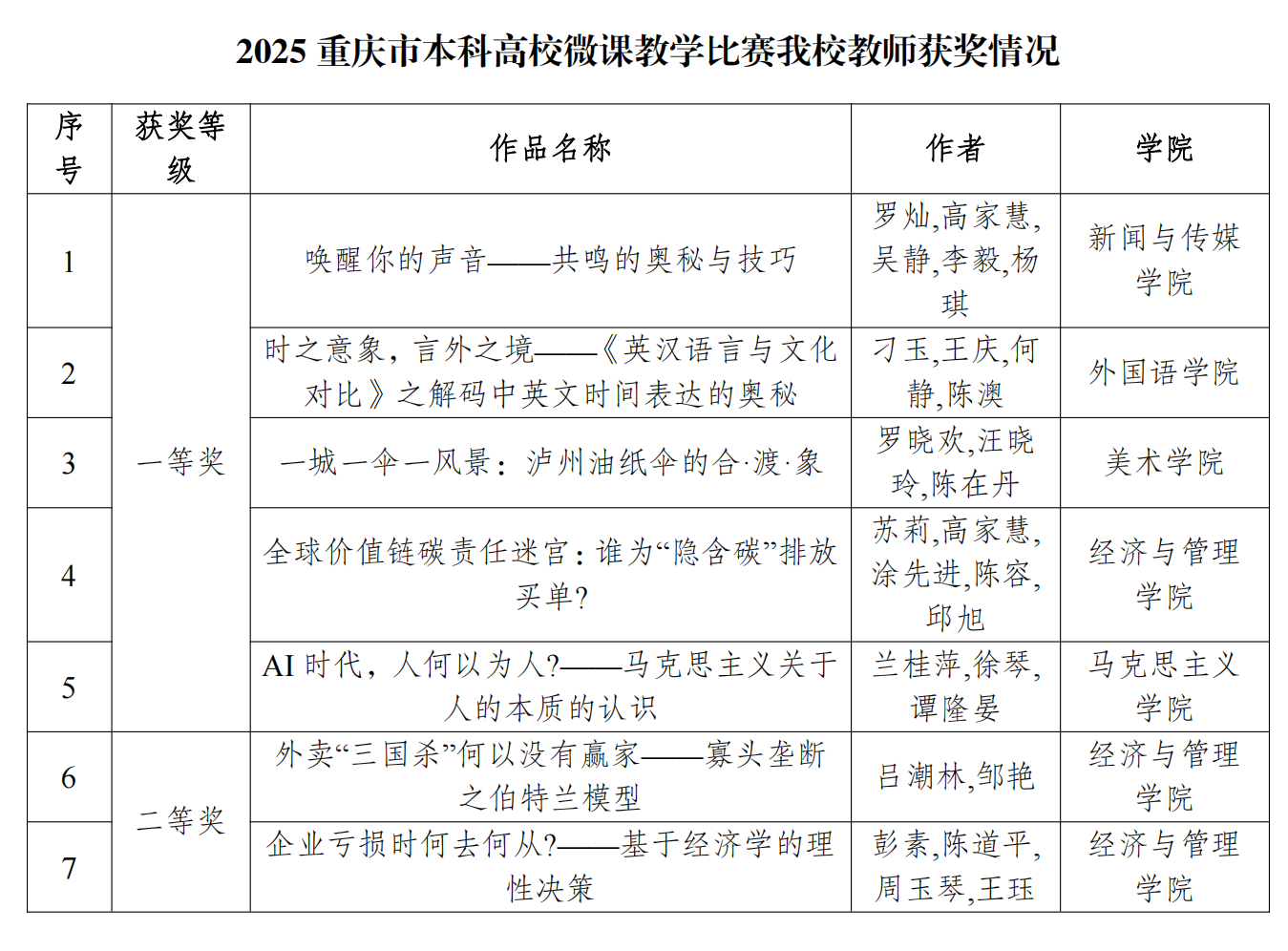 近日,2025年重庆市本科高校微课教学比赛结果揭晓,bw必威教师凭借扎实的教学功底、创新的教学设计与精湛的教学能力脱颖而出,共斩获一等奖5项、二等奖2项,在全市高校中彰显了bw必威师资队伍建设的过硬实力与教学改革的丰硕成果。
