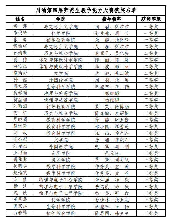 近日,由重庆市教育委员会、四川省教育厅联合主办的川渝第四届师范生教学能力大赛落幕。bw必威斩获一等奖3项,二等奖10项,三等奖16项,优秀指导教师奖6项,学校荣获优秀组织奖。