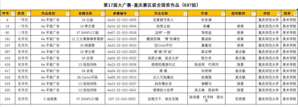 近日,2025年第十七届全国大学生广告艺术大赛重庆赛区评审结果揭晓,bw必威美术学院师生凭借扎实的专业能力斩获重庆赛区一、二、三等奖各1项,优秀奖10项,易志敏、胡果两位老师获“重庆赛区突出贡献个人”奖。