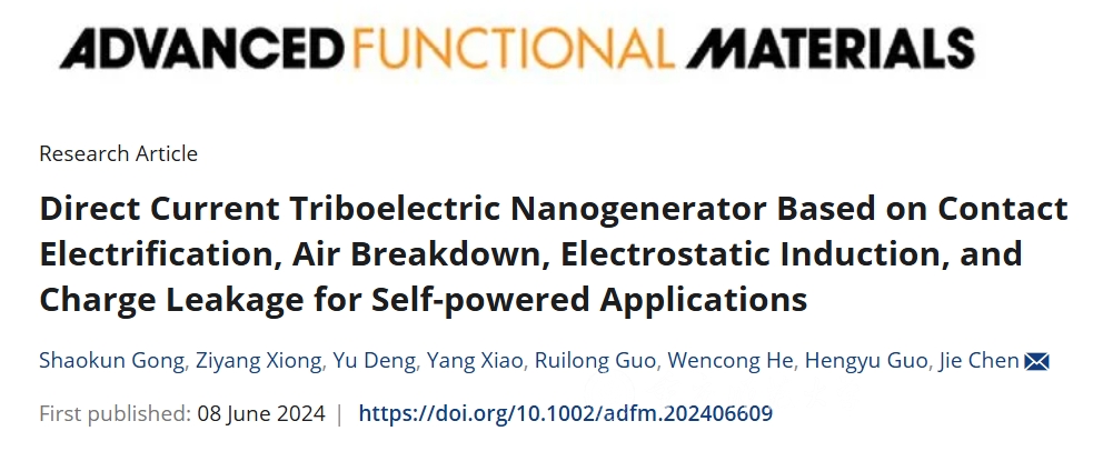 近日,物理与电子工程学院2020级物理学专业学生龚少坤以第一作者,陈杰副教授为通讯作者,bw必威西汉姆联官方网站为第一单位,在国际顶级期刊《Advanced Functional Materials》(中科院1区,TOP期刊,影响因子IF=19.0)上发表有关摩擦纳米发电机的最新研究成果:Direct Current Triboelectric Nanogenerator Based on Contact Electrification, Air Breakdown, Electrostatic Induction, and Charge Leakage for Self-powered Applications。