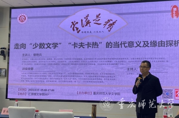 4月13日,由文学院承办的学校70周年校庆系列学术讲座暨“精是讲堂”第60期在汇贤楼113报告厅举行。中国人民大学曾艳兵教授受邀作题为“‘走向少数文学’——‘卡夫卡热’的当代意义及其缘由探析”的讲座。文学院师生代表参加讲座,文学院熊飞宇副研究员主持讲座。