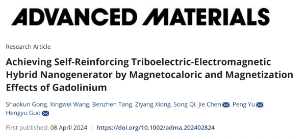 近日,物理与电子工程学院凝聚态物质科学创新团队以“Achieving Self-Reinforcing Triboelectric-Electromagnetic Hybrid Nanogenerator by Magnetocaloric and Magnetization Effects of Gadolinium”为题在国际顶级期刊《Advanced Materials》(影响因子29.4)上发表最新研究成果,本科生龚少坤与唐本镇博士为共同第一作者,陈杰副教授和余鹏教授为共同通讯作者,清华大学和重庆大学为合作单位。