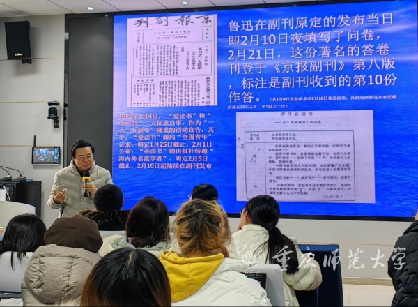 12月23日下午,四川大学文学与新闻学院院长、教授、博士生导师、国家万人计划哲学社会科学领军人才李怡教授在汇贤楼113报告厅,为文学院教师、2022级与2023级全体研究生、部分本科生以及重庆其他高校部分教师精彩讲述了他理解中的“鲁迅与‘青年必读书’事件”。文学院副院长凌孟华教授主持讲座。
