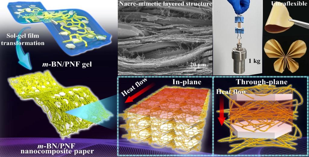 随着电子器件和电气设备不断朝微型化、集成化发展,使其内部热量积聚现象愈发严重,这对聚合物基导热复合纸的导热性能提出了更高要求。此外,为了避免微型电气部件之间形成短路电流,且信号相互干扰,电子电气领域用聚合物基导热复合纸还应具有优异的电绝缘性能和耐热性能等,以满足在实际电子工程中的应用。该研究成果通过“溶胶-凝胶”薄膜转化工艺将表面功能化的氮化硼(m-BN)与聚对苯撑苯并二噁唑纳米纤维(PNF)均匀复合,制备出仿贝壳珍珠层结构的m-BN/PNF纳米复合纸。基于m-BN与PNF之间的氢键和π-π电子相互作用,m-BN/PNF纳米复合纸具有优异导热性能和出色电绝缘性能,其λ∥和λ⊥分别为9.68 W/(m·K)和0.84 W/(m·K),体积电阻率和击穿强度为分别高达2.3×1015Ω·cm和324.2 kV/mm,有望在电子器件和电气设备等领域获得广泛的应用。