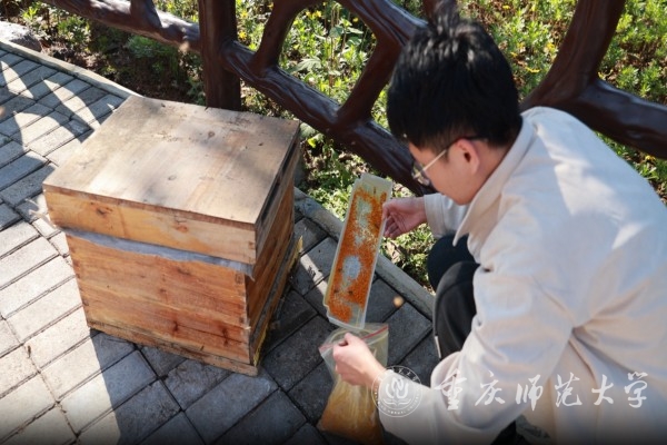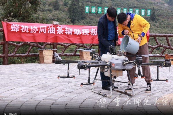 黄敦元团队主要从事油茶传粉昆虫的保护与利用等方面的研究。团队依托农业农村部长江上游传粉昆虫资源保护与利用重点实验室等省部级科研平台,研发蜂机协同油茶辅助授粉技术,主要通过油茶花期放养中华蜜蜂为油茶授粉的同时收集中华蜜蜂携巢花粉,并通过无人机喷施液体花粉辅助油茶授粉,前期在重庆、江西、湖南等地的区域化实验结果显示该技术可以提高12%-25%的油茶座果率。