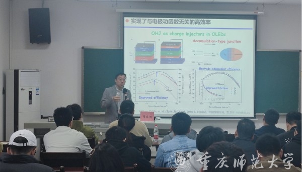 讲座中,马东阁教授主要介绍了其团队围绕有机光电器件与物理开展基础和应用研究取得的相关成果,包括在有机发光二极管(OLEDs)、有机光电探测器(OPDs)、有机半导体激光(OSLs)等方面取得的一系列创新性成果。例如,有机半导体异质结大电荷注入技术、高效率白光OLEDs的激子限制结构、热激子调控与高效率蓝光荧光OLEDs、AIE蓝光热激子材料与OLEDs等相关理论。