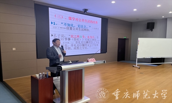 李承贵教授分“儒学是提升生活的学问”“儒学是精彩生活的智慧”两部分展开讲座。关于“儒学是提升生活的学问”,李承贵教授指出,一是儒学对物质生活的追求,比如《尚书》提出“利用、厚生”,孔子强调“先富后教”,孟子主张“制民之产”。二是儒学对精神生活的丰富,比如对娱乐生活、知识生活、情感生活、道德生活的肯定与追求。三是儒学对公共生活的改善。他以“礼”为例,认为儒家的“礼”具有设置公共生活网络、协调公共生活秩序,以及提升公共生活质量的功能。随后,李承贵教授从儒学开辟生活、经营生活、疏通生活三个方面对“儒学是精彩生活的智慧”进行了梳理。他强调,只要能够将儒学的智慧正确贯注于生活实践,我们的生活就会变得更加精彩。