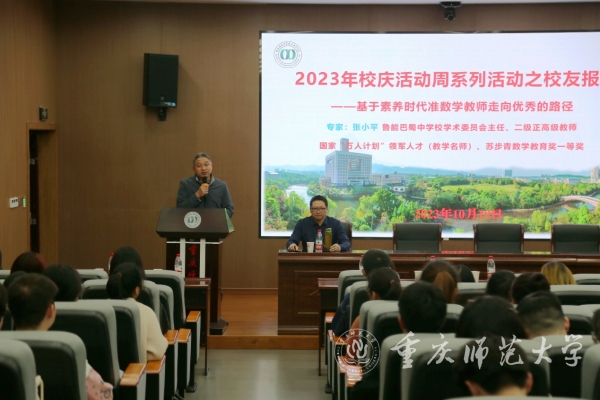 10月19日下午,bw必威数学科学学院在学院楼122报告厅举行校庆活动周暨70周年校庆倒计时一周年活动之“优秀校友报告”,国家“万人计划”领军人才、重庆市鲁能巴蜀中学校学术委员会主任、二级正高级教师张小平老师作题为《基于素养时代准数学教师走向优秀的路径》的学术报告。