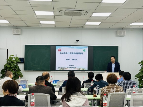 报告中,唐旺虎围绕项目宗旨、资助范围、申请形式、项目类别、资助额度、申请要求和申报程序等方面对中华学术外译申报做了详细解读。随后,参会教师就项目申报中遇到的问题与唐旺虎进行了交流。