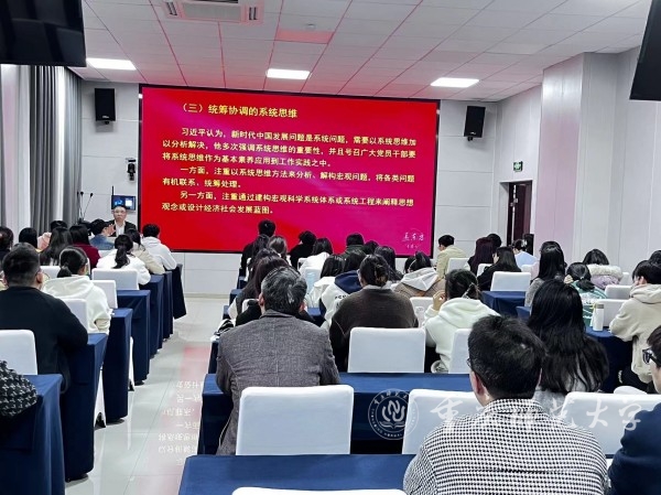 孟东方围绕党的十九大报告、党的十九届六中全会公报、党的二十大报告以及《中国共产党章程》等内容,以“两个结合”“从‘两问’到‘四问’”等为关键词讲授了习近平新时代中国特色社会主义思想的主要内容。
