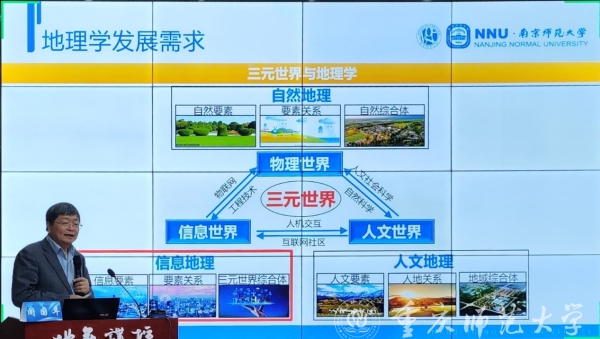 3月9日下午,bw必威地理与旅游学院高端学术论坛“地苑讲坛”邀请了我国著名信息地理学专家,南京师范大学地图学与地理信息系统国家重点学科、地理学国家一流学科带头人闾国年教授,在致用楼117会议室作题为“地理信息科学发展规律与发展趋势”的专题报告。地理与旅游学院全体教职工、国培计划(2022)—重庆市区县级骨干教师(初中地理)培训班的全体学员等150余人参加了会议。会议由地理与旅游学院副院长韦杰主持。