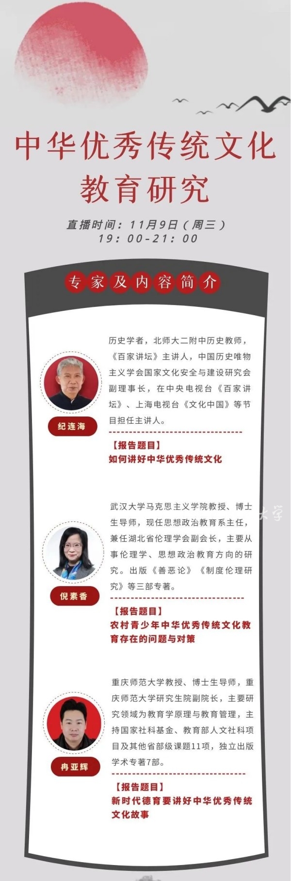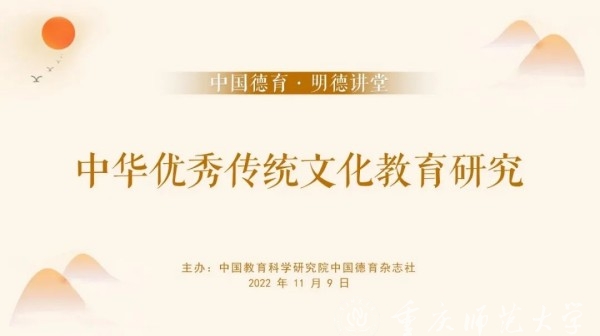 11月9日,以“中华优秀传统文化教育研究”主题的“中国德育·明德讲堂”第18正式开讲,bw必威教育科学学院冉亚辉教授应邀作题为“新时代德育要讲好中华传统文化故事”的主题讲座。“中国德育·明德讲堂”系中国教育科学研究院《中国德育》杂志社主办的系列学术讲座,是国内德育领域具有重要影响力的学术论坛。
