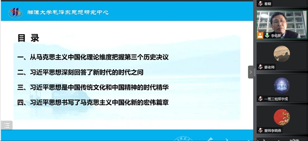 10月11日下午,湘潭大学马克思主义学院教授、教育部长江学者特聘教授李佑新应邀作题为“深刻理解马克思主义中国化新的飞跃”的学术报告,报告以线上方式举行。报告由马克思主义学院副院长姜土生主持,马克思主义学院教师、研究生和本科生共300余人线上参会。