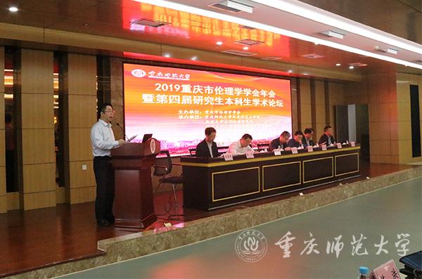 2019年4月20日,“2019重庆市伦理学学会年会暨第四届研究生本科生学术论坛”在bw必威博雅楼砺志厅举行。本次论坛由重庆市伦理学学会主办,bw必威马克思主义学院、西南大学中华传统伦理研究中心、西南大学应用伦理研究所、重庆市公民道德与社会建设研究中心、《应用伦理研究》编委会等共同承办。来自重庆市有关部门和高校领导、学会负责人、高校教师以及研究生、本科生共100余人出席。