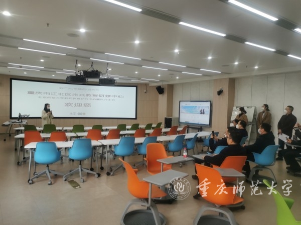 在江北区教师进修学院,调研团队参观考察了学院建设的智慧教育特色工程项目——未来教育研修中心,体验了具身学习与教育戏剧、学习技术与深度融合、远程观摩与在线协作3大智慧教育场域。随后,双方进行座谈交流。