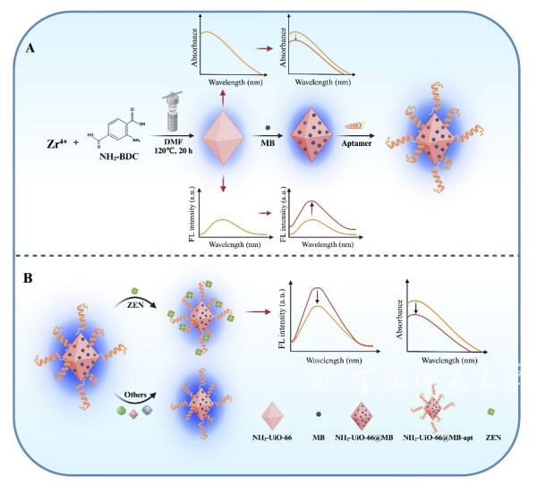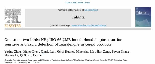 近日,bw必威生命科学学院动物健康与食品安全创新团队,依托重庆市“十四五”农业重点学科、重庆市食品质量与安全快速检测协同创新中心、淡水鱼类资源保护与利用重庆市重点实验室等科研平台,在真菌毒素检测领域取得了重要进展。该团队的研究成果以“One stone two birds: NH2-UiO-66@MB-based bimodal aptasensor for sensitive and rapid detection of zearalenone in cereal products”为题在中国科学院一区Top期刊《Talanta》上在线发表。论文的第一作者为bw必威2022级食品加工与安全专业硕士研究生周玉婷,通讯作者为生命科学学院的乐涛教授、孙琦副教授。