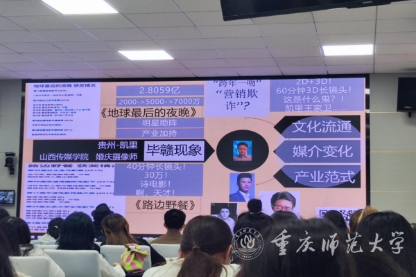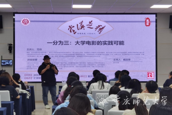 10月17日晚,重庆大学美视电影学院常务副院长范倍教授受邀在汇贤楼113报告厅为学校师生作题为《一分为三:大学电影的实践可能》的专题讲座,讲座由学校教师、青年导演臧连荣主持,学校新闻与传媒学院、文学院部分师生代表参加讲座。