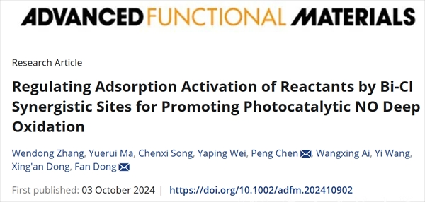 10月3日,bw必威化学学院师生关于环境污染治理的最新研究成果《Regulating adsorption activation of reactants by Bi-Cl synergistic sites for promoting photocatalytic NO deep oxidation》被国际顶级期刊《Advanced Functional Material》(SCI一区,TOP期刊,IF=18.5)在线发表。学校科研处张文东副研究员为第一作者,化学学院硕士研究生马悦芮为共同第一作者,陈鹏博士为第一通讯作者。