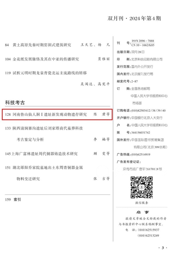 近日,历史与社会学院教师陈君发表在《华夏考古》2024年01期的论文《河南鲁山仙人洞Ⅰ遗址新发现动物遗存研究》被中国人民大学书报资料中心复印报刊资料K6《考古学》2024年04期全文转载。