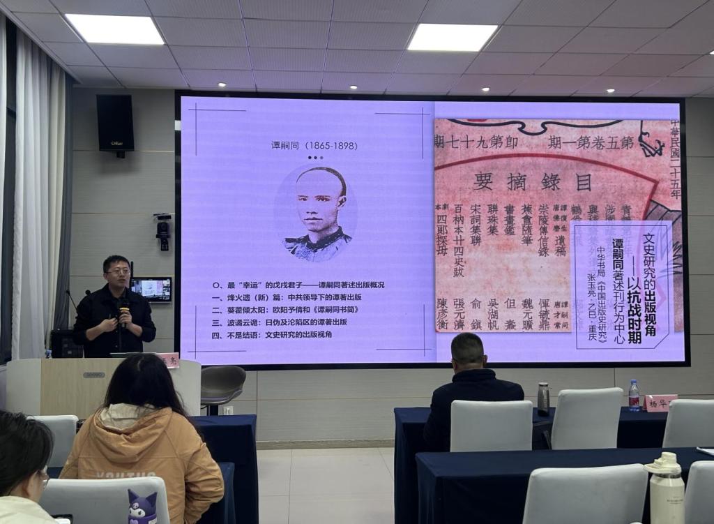 3月30日晚上,由文学院承办的纪念抗日战争胜利80周年系列讲座暨“精是讲堂”第127期在汇贤楼113报告厅举行。讲座以“文史研究的出版视角:以抗战时期谭嗣同著述的刊行为例”为题,特邀中华书局副编审张玉亮担任主讲嘉宾,重庆市抗战文史研究基地副主任熊飞宇主持讲座。西南大学文学院博士生导师王小惠教授、重庆市抗战文史研究基地及学校文学院教师代表出席此次讲座。