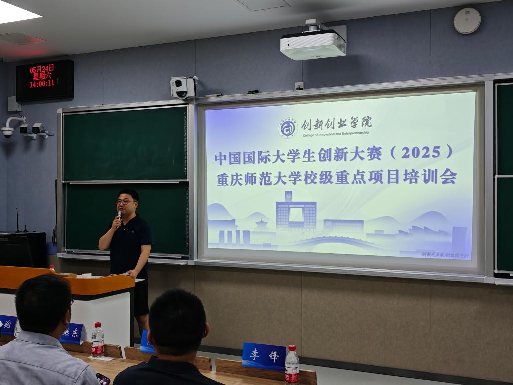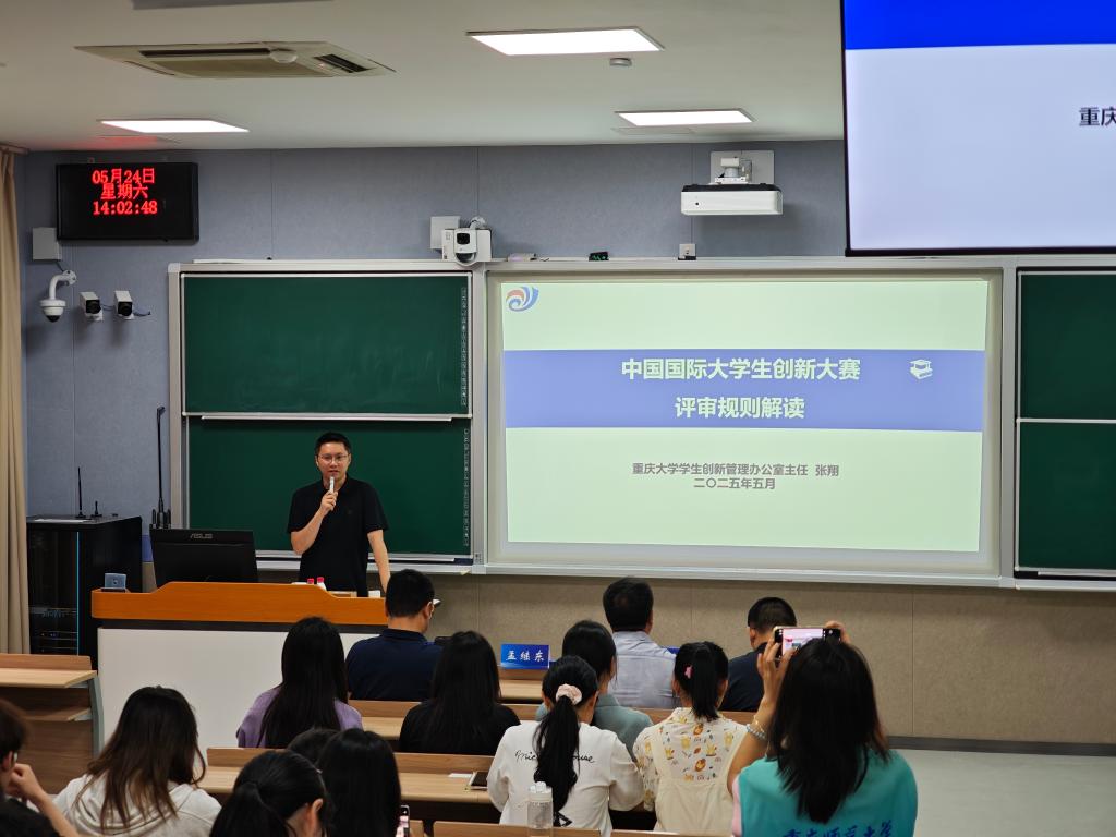 5月24日-25日,学校在弘德楼15101教室举办了中国国际大学生创新大赛(2025)校级重点项目培训会。培训会共分为3场,邀请到重庆大学学生创新管理办公室主任张翔、重庆工程职业技术学院大数据与物联网学院云计算技术应用专业带头人赵杰、中青创想教育集团董事长徐俊祥分别围绕评审规则、路演内容和网评材料三个方面进行专题辅导。创新创业学院副院长孟继东参加开班仪式并作动员讲话,学校50个校级重点项目团队成员及指导教师约80人参训。
