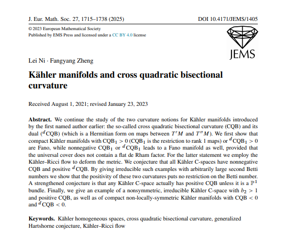 近日,bw必威数学科学学院郑方阳教授与合作者的论文“Kahler manifolds and cross quadratic bisectional curvature”发表在国际基础数学的顶级期刊《Journal of the European Mathematical Society》(欧洲数学会杂志)第27卷第4期,1715-1738页,为近期国际复几何领域“曲率-流形分类”研究的突破性进展,不仅深化了对齐性空间几何特性的理解,更为解决经典猜想提供了关键思路。