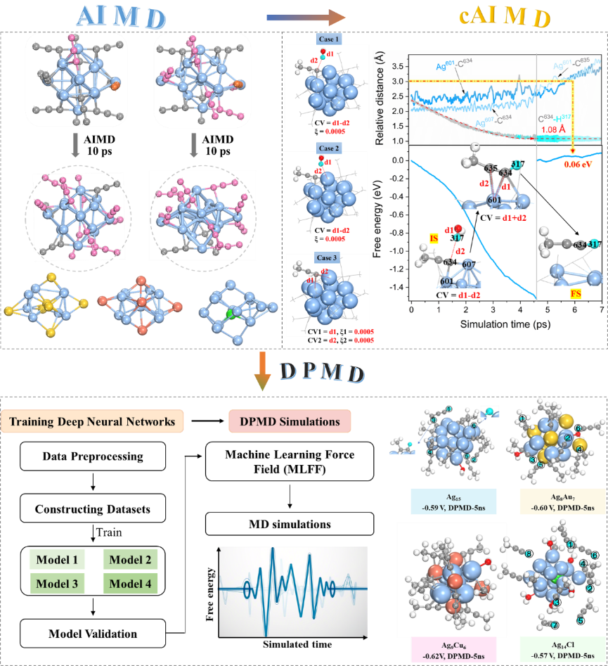 原子精确的银纳米团簇作为新兴电催化剂,在CO2还原等反应中展现出高活性和选择性,但其电化学工况下的动态结构演化机制尚不明确。传统实验表征难以解析原子尺度动态行为,而从头算分子动力学(AIMD)受限于皮秒级模拟尺度,无法捕获长程演化过程。为此,作者通过整合多尺度模拟(恒电势AIMD、约束性AIMD及深度势能分子动力学),首次揭示Ag15团簇及其掺杂体系(Ag8Au7/ Ag9Cu6/Ag14Cl)的电化学动态稳定性规律:所有团簇内核均从八面体向无序结构转变,表面炔基配体发生部分键断裂或全完整裂解;掺杂原子通过调控脱附路径显著影响稳定性,其中Ag₉Cu₆团簇因强Cu-C键显著抑制解离。基于机器学习力场(MLFF)的纳秒级DPMD模拟进一步证实,表面炔基配体解离数量(Ag15:4个、Ag8Au7:6个、Ag14Cl:8个)和内核无序化程度与掺杂类型相关,且≥2000 ps的长时程模拟是捕获动态稳定性的关键。该研究突破了AIMD尺度限制,实现了纳秒级近DFT精度的动态解析,为理性设计高稳定性银基团簇催化剂提供了原子级机制与理论研究新范式。