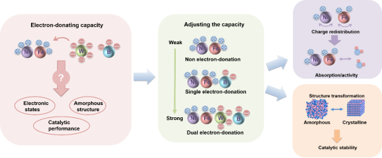 图:钨-硼(W-B)调控电子给体能力提高催化性能:电子给体能力→电子态 →抑制晶化 → 稳定性