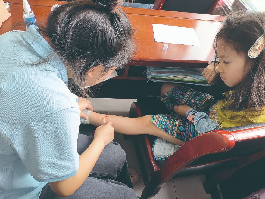 ▲杨轹文给小朋友的伤口擦药