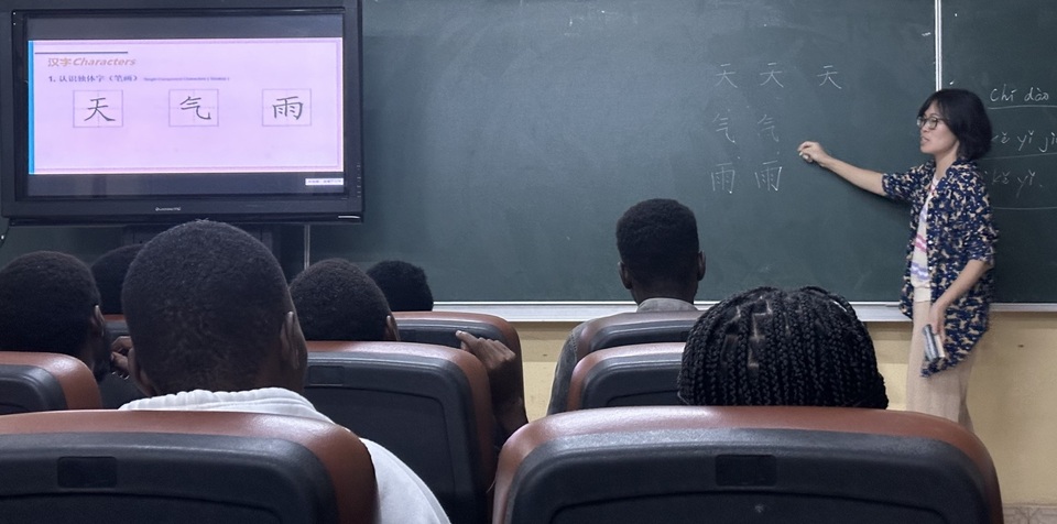2023年10月,卢旺达大学孔子学院段伊若在给学生上公开课