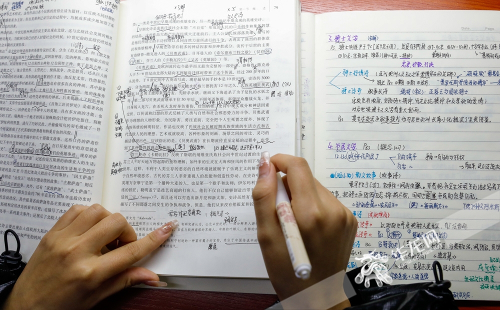 重庆医科大学2022级护理专业学生吴玲虽然嘴上这样开玩笑,复习起来却无比认真。她这学期她要考14门课程,为迅速突围,她从学姐那里借来这份“传承”多年的专业课笔记。