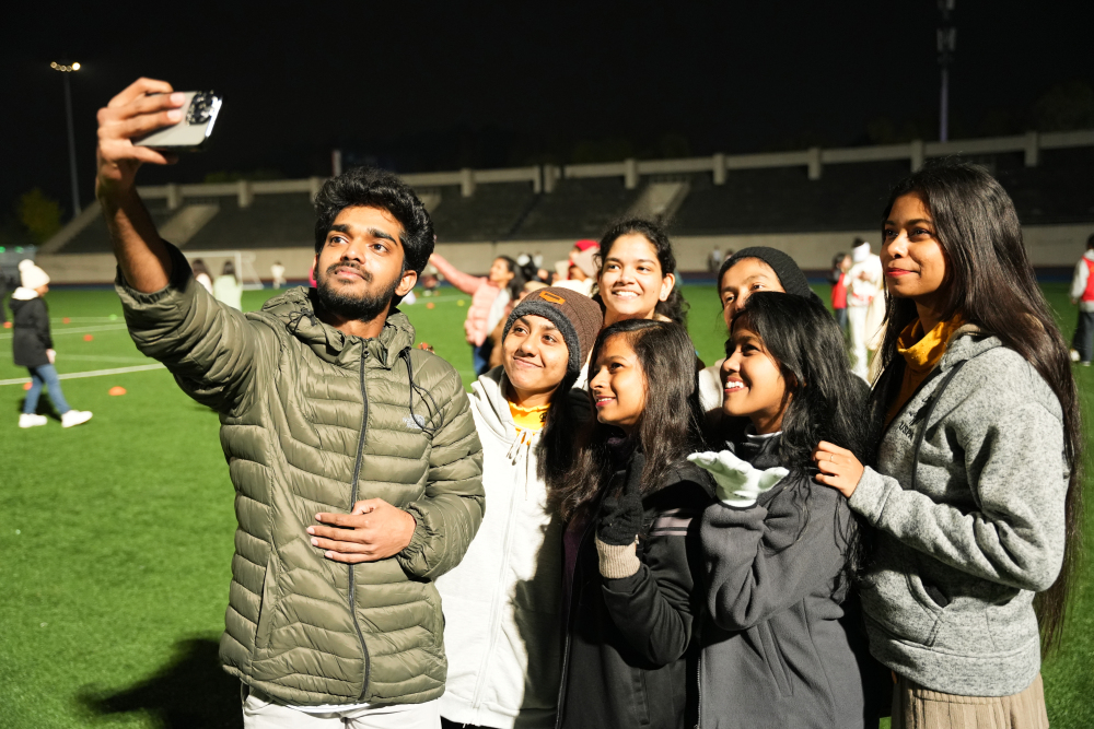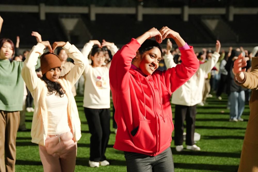 ▲刚刚跳完广场舞的斯里兰卡留学生在运动场上合影留念。