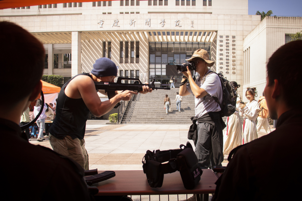 ▲学生在西南政法大学“利剑特勤队”社团区参与体验。记者 齐岚森 实习生 辛飞 摄