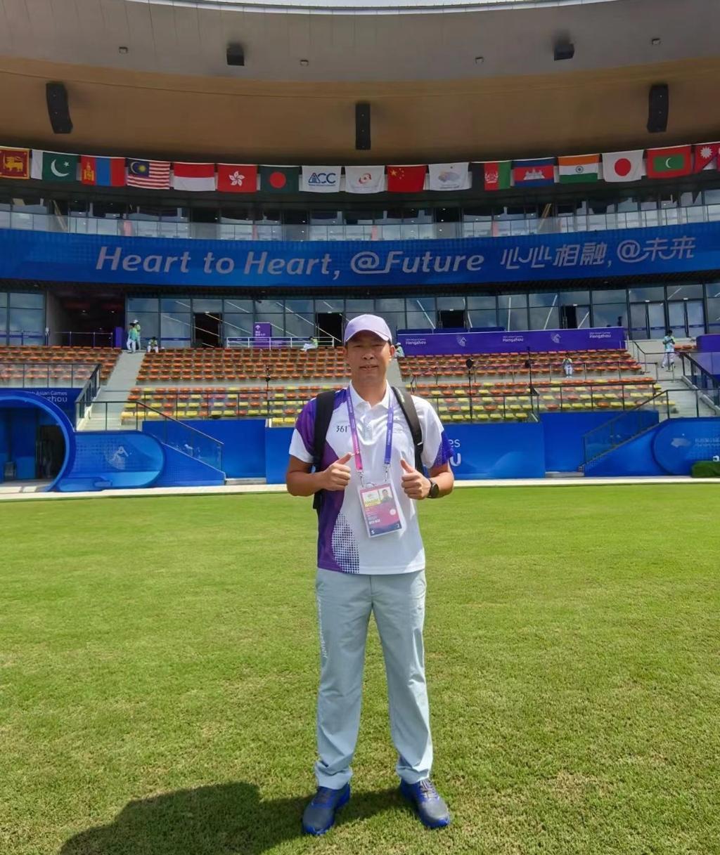 来自重庆市板球协会的张鹏,曾在2010年、2014年两度代表中国男子板球国家队出征亚运。退役后,张鹏成为重庆市南岸区青龙路小学的一名体育老师,指导校内的板球队。如今,他以板球项目国内技术官员的身份,再度登上亚运会赛场。