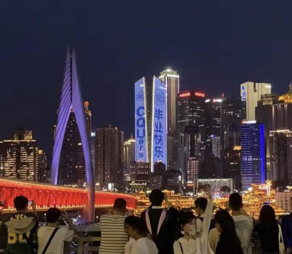 6月28日晚,重庆大学团委为2023届毕业生“承包”一栋楼。在城市地标建筑重庆复星国际中心的外立面上轮换着重庆大学校训、毕业宣言、暖心祝福闪耀“两江四岸”。