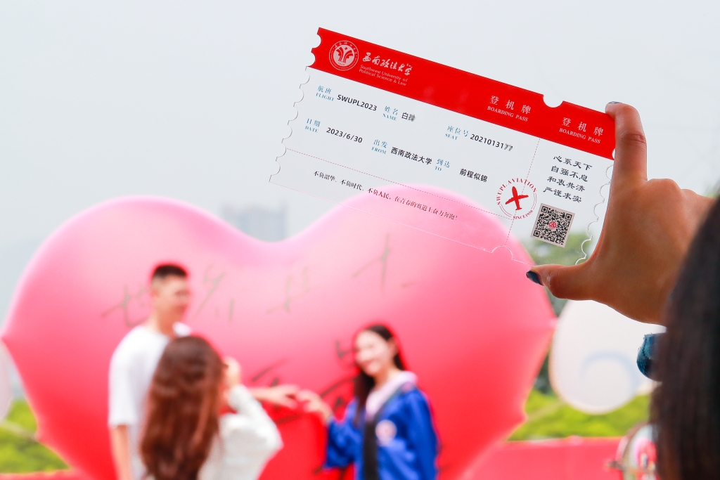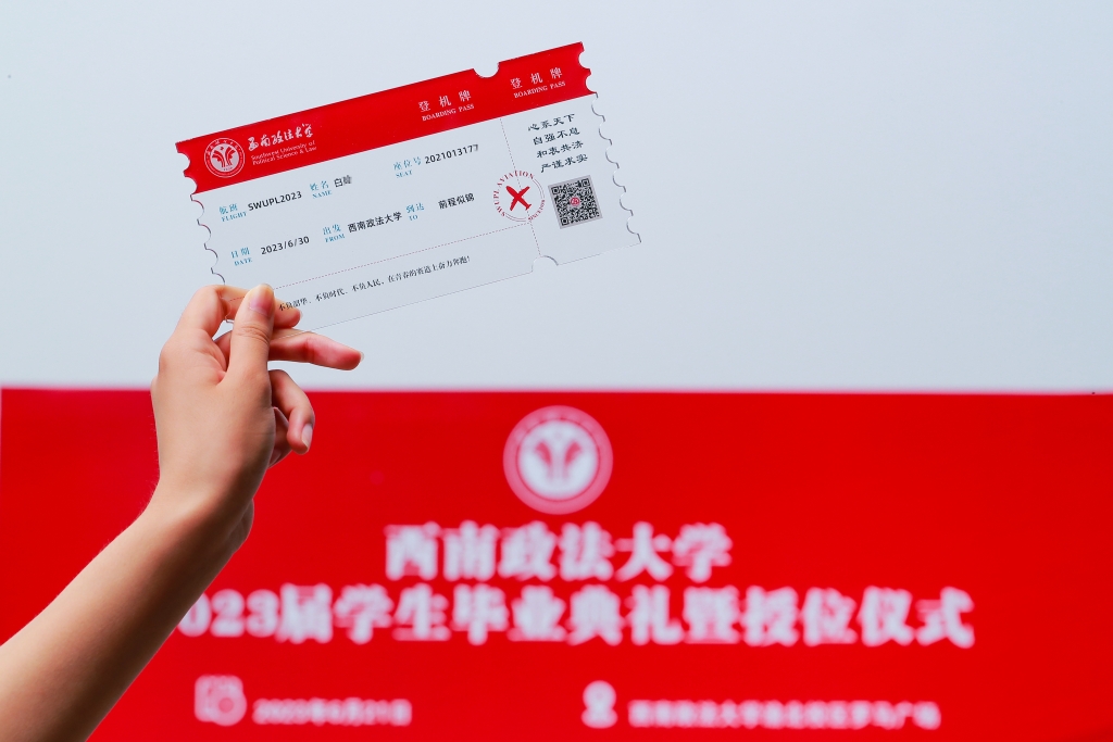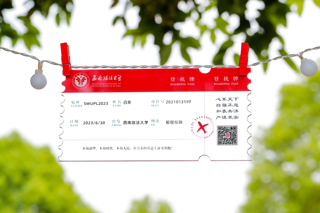 西南政法大学的毕业礼物是一个刻有毕业生名字的亚克力登机牌,登机牌上显示大家从“西南政法大学”启航,到达“前程似锦”,“西政精神”下有着“西政校友”身份的验证码。