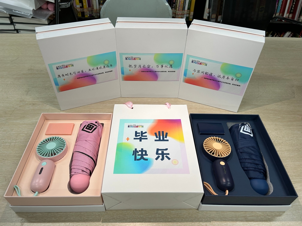 正值毕业季,四川美术学院影视动画学院为2023届毕业生准备了晴雨伞和电风扇套装,晴雨伞晴天可以遮挡阳光;雨天可以遮挡暴雨。电风扇吹走炎热夏日的高温,并且还贴心地在礼盒封面,给每位同学送上个性化的毕业寄语,祝影视动画学院2023届毕业生前程似锦。