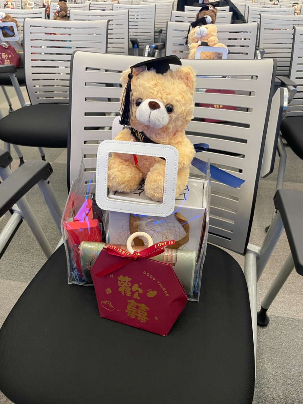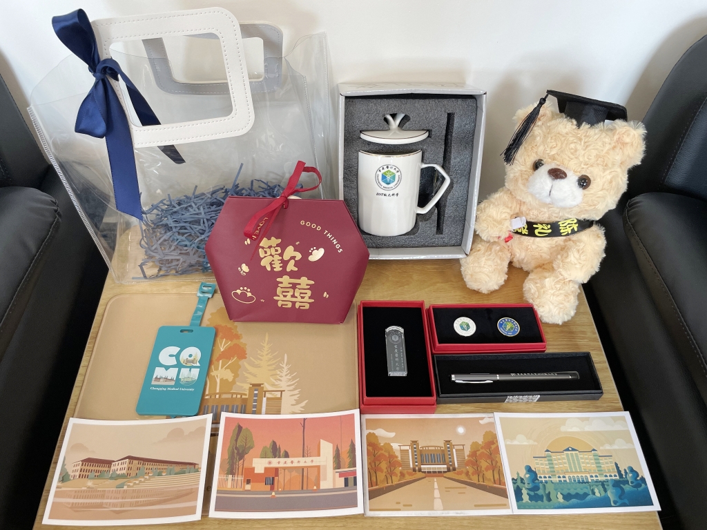 重庆医科大学儿科学院为274名本科毕业生送上印有自己名字的“毕业小熊”大礼包一份,礼包中除了一只可爱的学士熊以外,还包括鼠标垫、校徽、定制水杯、定制印章、定制笔等物品。