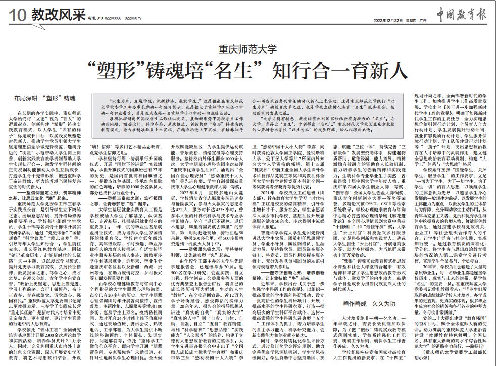 准确把握新时代高校学生工作核心要义,直面新形势下高校学生工作的新问题,顶层设计、科学布局、系统推进,创新构建“塑形”铸魂实践教育模式,着力在精准施策上出实招,在精准推进上下实功,在培养知行合一堪当民族复兴重任的时代新人上求实效。这是bw必威西汉姆联官方网站践行“以生为本”的教育改革之道,也是学校立德树人培育“名生”服务社会、报效国家的发展之道。