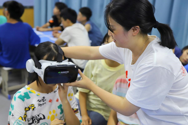 教师志愿者在为学生佩戴VR眼镜。