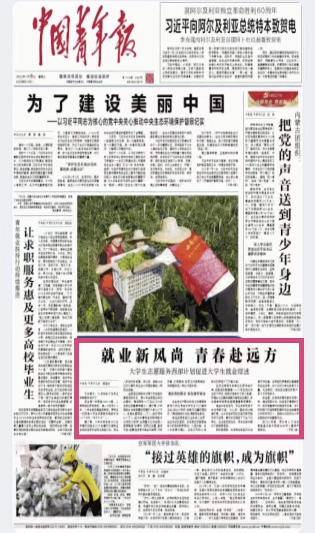 7月6日,中国青年报头版报道大学生志愿服务西部计划促进大学生就业综述。